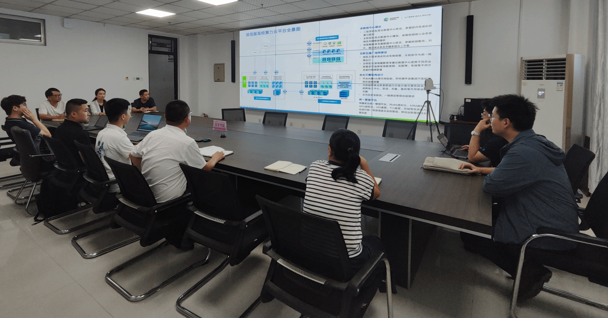 分享会上,专家首先深入剖析了当前高校面临的资源分散、管理复杂、安全风险高、利用率低等共性挑战,并结合国家在云计算、大数据与人工智能领域的战略导向,系统阐述了“统一规划、安全可控、按需供给、节能环保”的建设理念。随后,专家重点介绍了深信服高校算力云平台的整体架构与核心功能,涵盖多数据中心协同、统一资源调度、GPU虚拟化、云原生开发支持及可视化运维管理等模块,并借助曲阜师范大学、山东女子学院等高校的成功案例,生动展示了该平台在提升资源利用率、简化运维流程等方面的显著成效。